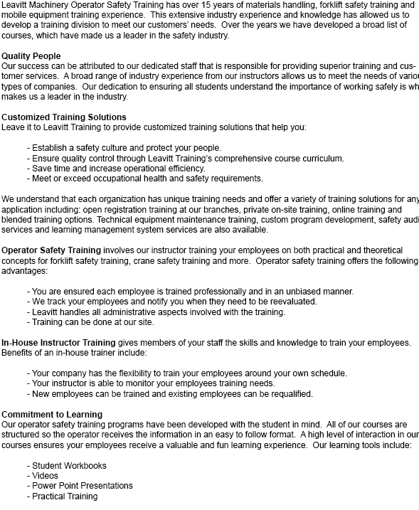 The huge range of start times and programs we provide should ensure that you come across the perfect match for your needs. Whether you are searching for someone to come train at your place of work or would prefer to train at our facility, we can accommodate all your needs. Our experienced staff can tailor our training to your particular equipment at your site of business.